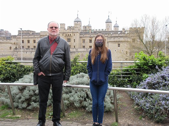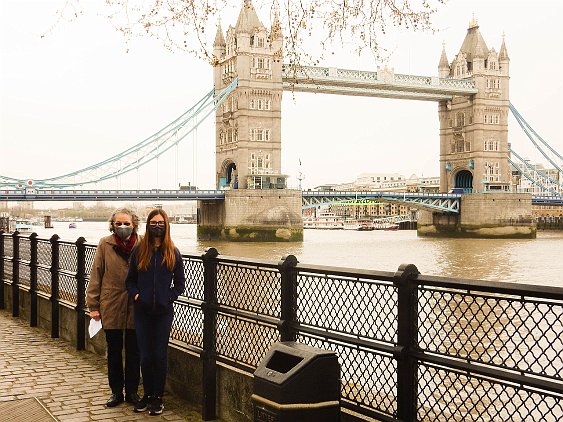 Patricia and Abby near the Tower of London with the London Bridge in the background. Typical London weather.