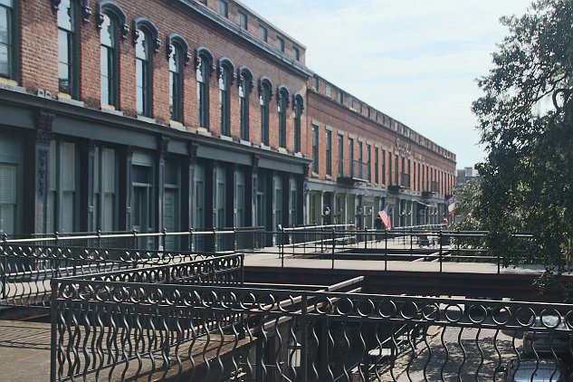 Warehouses are below street level and the factoring office are above them. The river is to the right, behind the buildings.