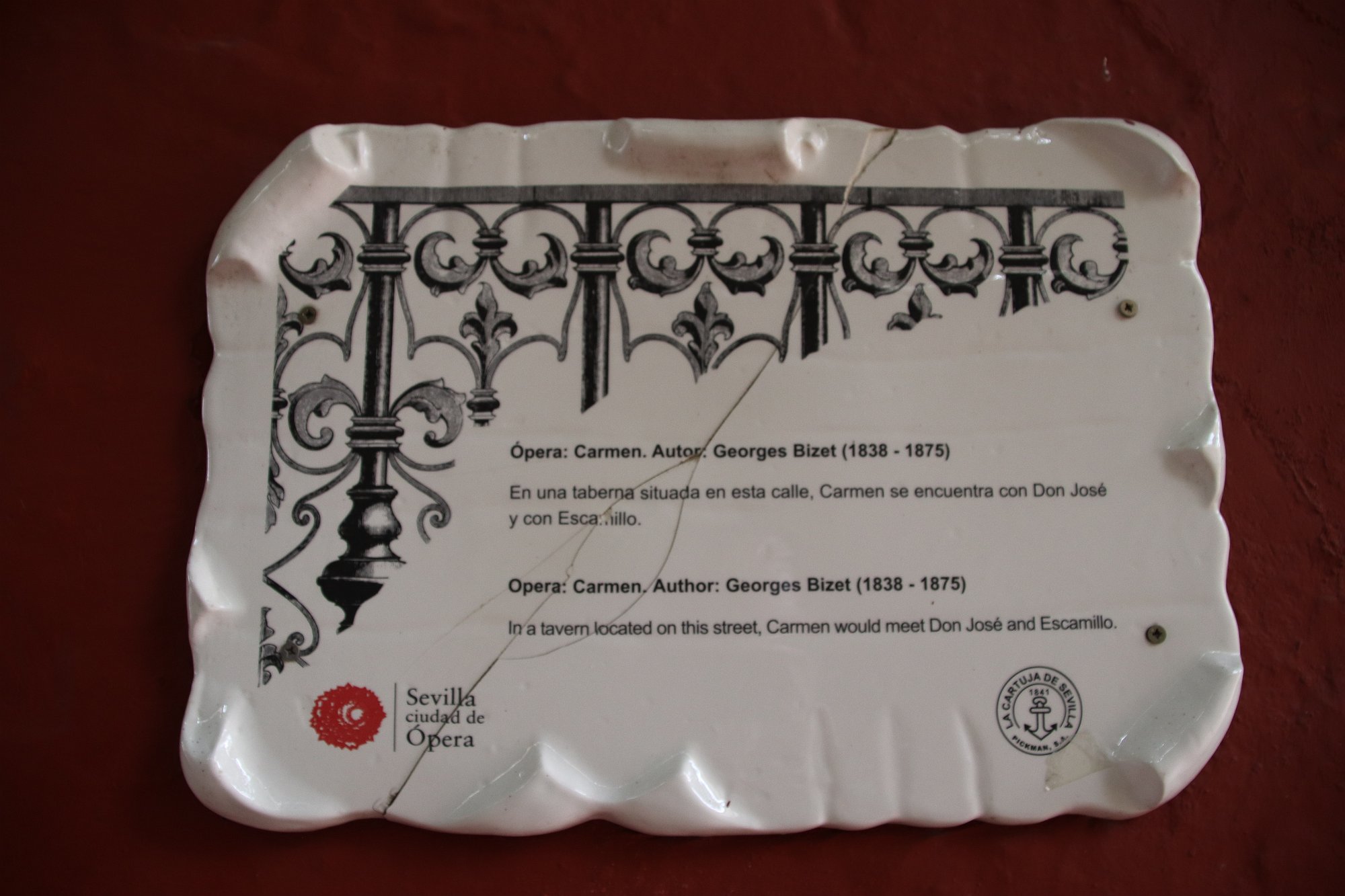 Esta placa está en un restaurante en la Calle Agua. ¡Es una mentira! Of course the opera Carmen is fiction, so this plaque is a lie. It is found on Calle Agua.