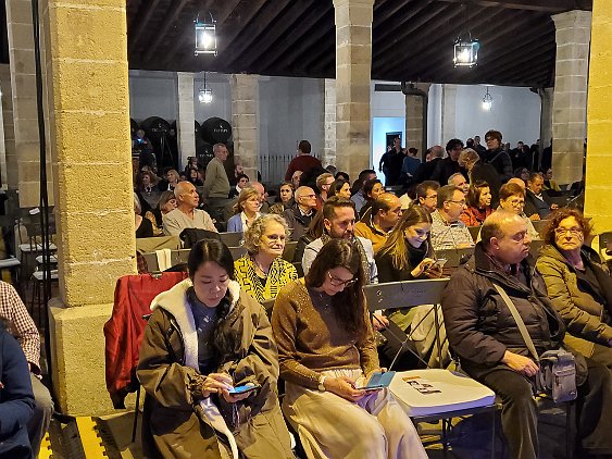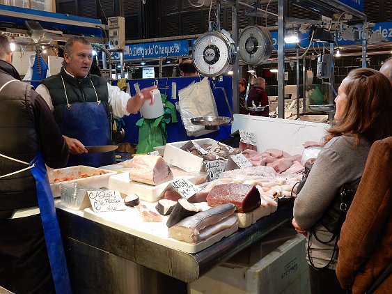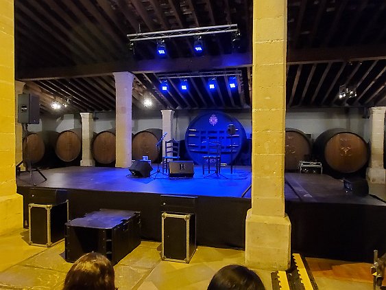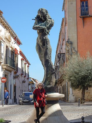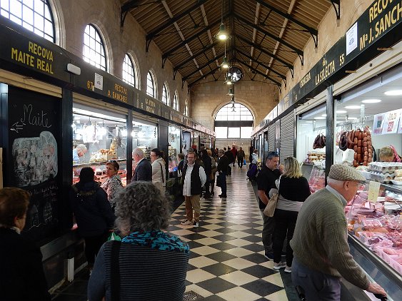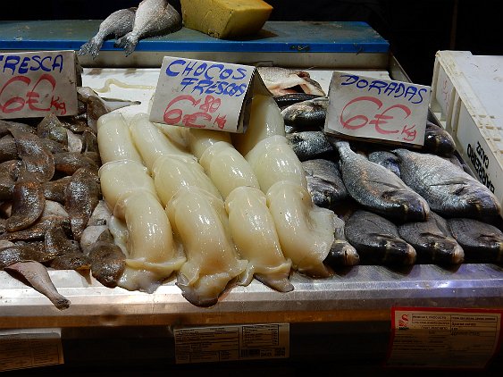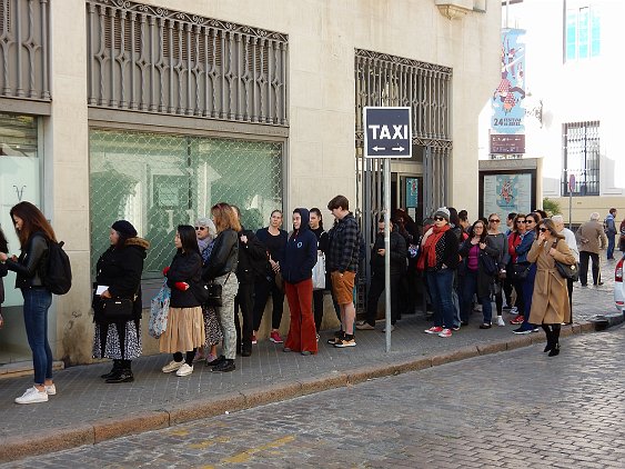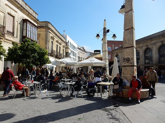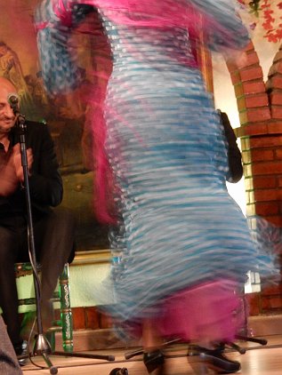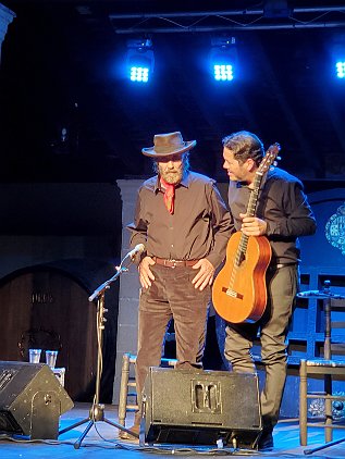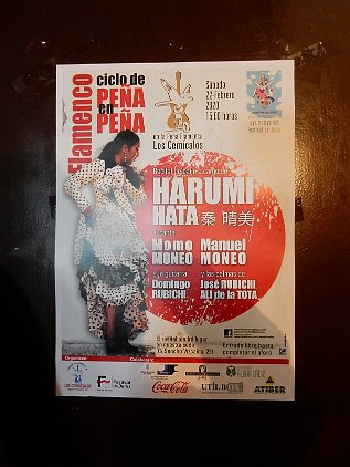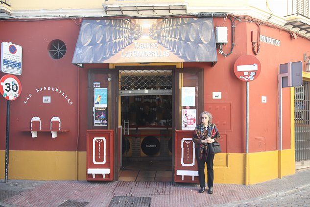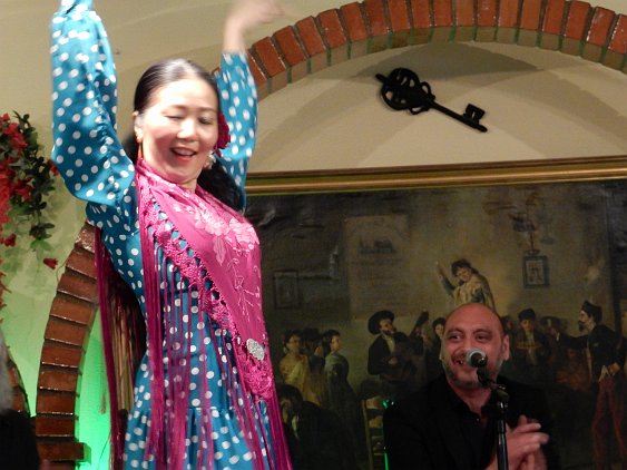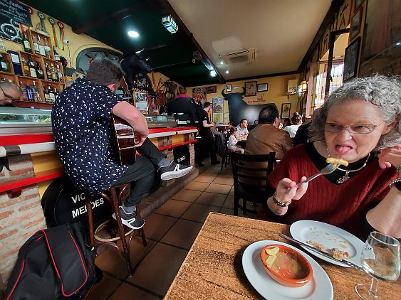 Las Banderillas was just a few steps down from our Airbnb. We ate there several times The tapas were good. From time to time someone would play music and then pass the hat. Plaza de Arenal on our first evening in Jerez. The long line to pick up tickets for the Festival at Teatro Villamarta. We spent a lot of time here during our 8 days in Jerez. Plaza Esteve. In contrast to our last trip, it was good weather while we were there this time. The central market on Plaza Esteve "Abastos" means "supplies" Several aisles of meat, fish, cheese, and vegeetables Some of the seafood looked unappealing to me. (galeras are mantis shrimp from the gulf of Cadiz) You are welcome to try the chocos (cuttlefish). They will prepare the custs just the way you want. Just before our first performance at Villamarta The setup at Gonzalez Byass (bodega Tio Pepe) for our first midnight performance For once, there were assigned seats, which is a definite plus at this venue. El Cabrero (the goatherder) on one of his last stops as a performer Patricia at the Lola Flores statue. Lola Flores was a truly famous Jerezano dancer. We went to a free peña performance where we saw Harumi Hata. Everyone at peña Cernícolas enjoyed the performance. Capturing the energy / motion of the dancers is difficult. Seville