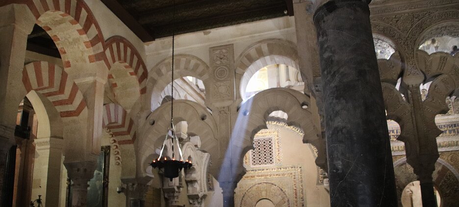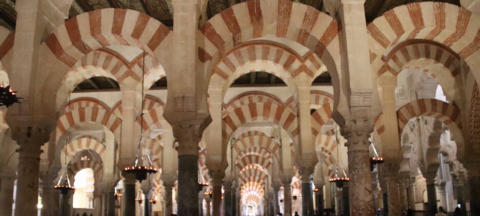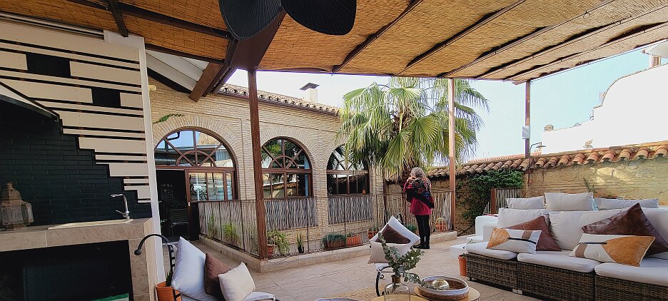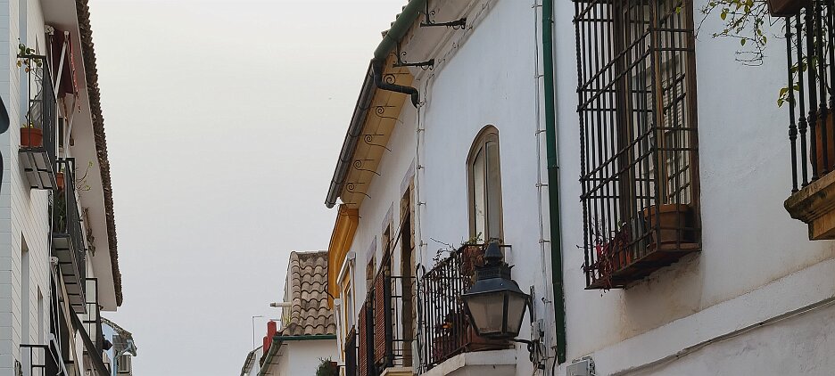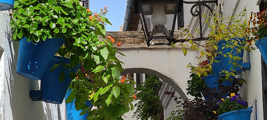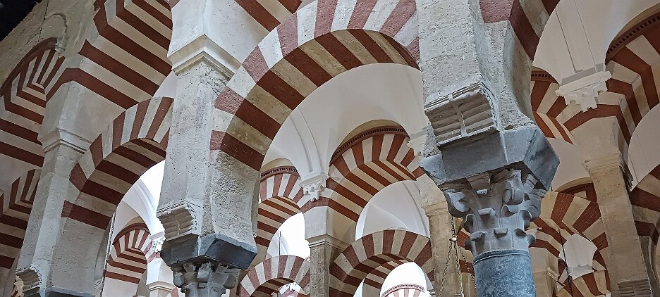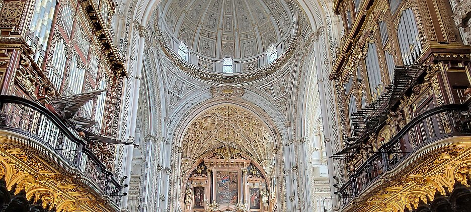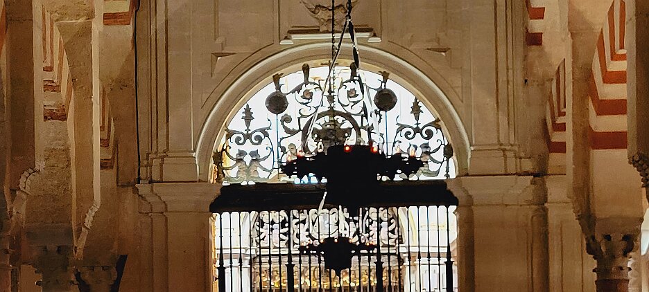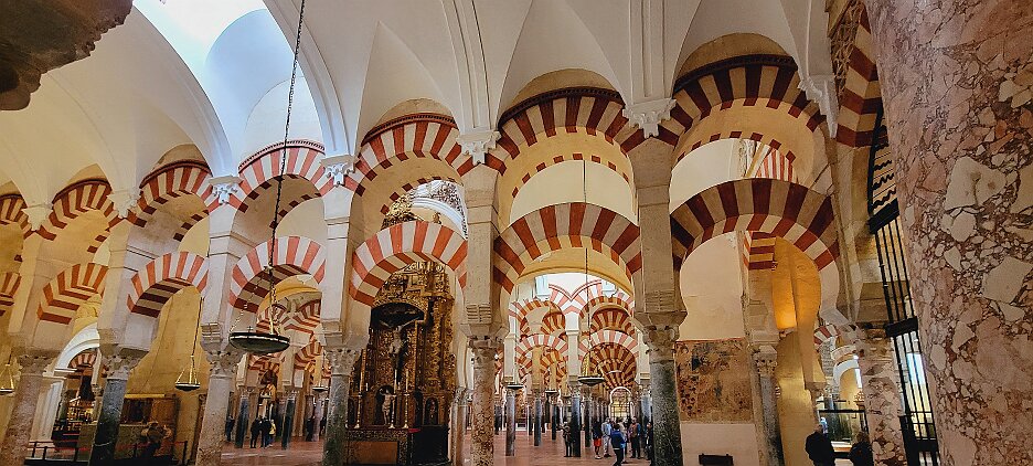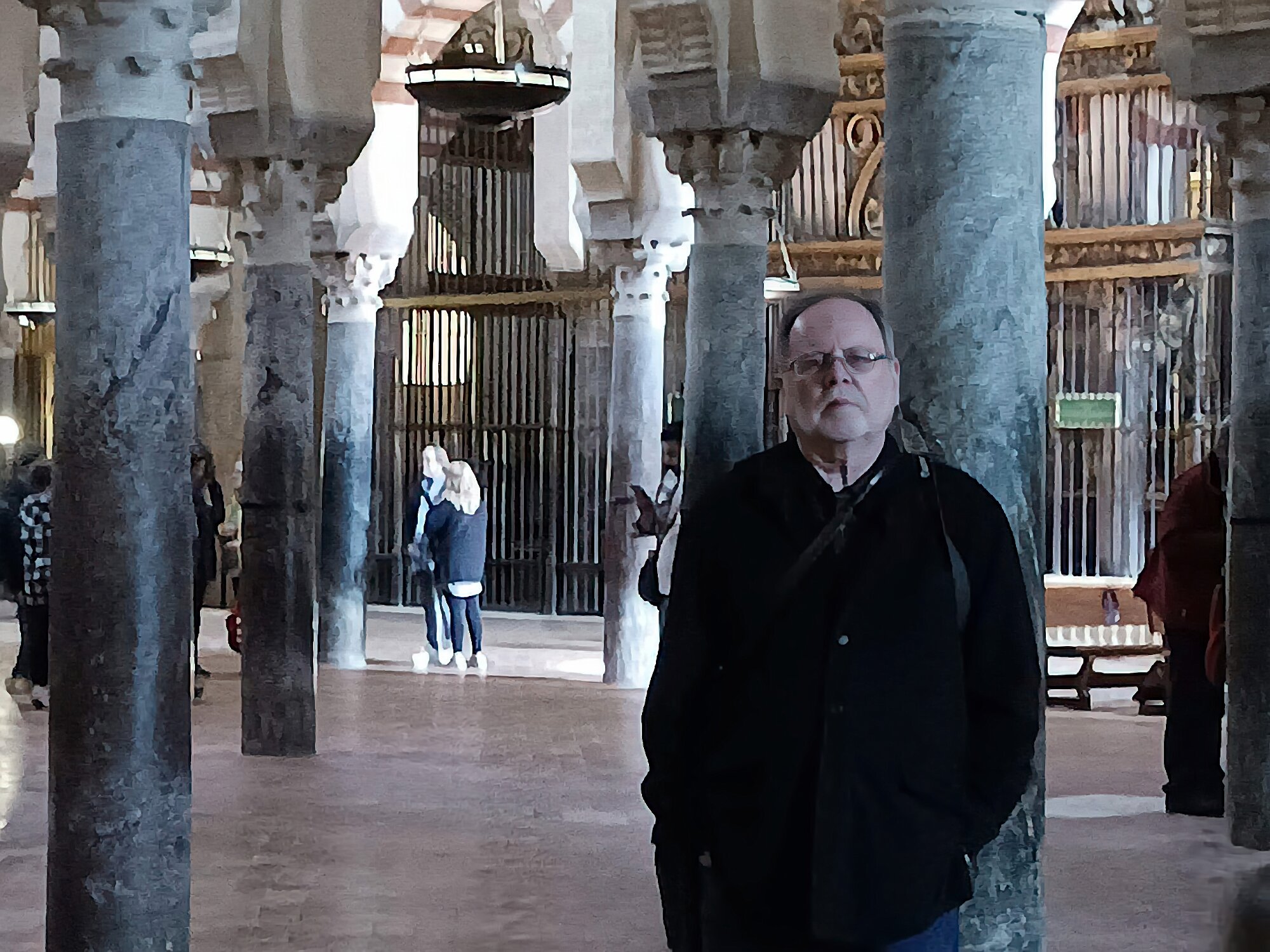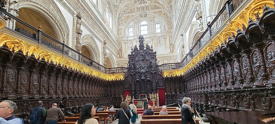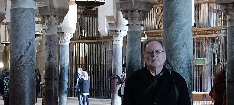 On the patio at Patio del Posadero in Córdoba. We like to stay in this small boutique hotel. Our room was set up very nicely. Córdoba has many small streets for us to wander. We no longer get lost. Bell tower of Altar de San Rafael, off C. Lineros, in Córdoba One of the great breakfasts we were served at Patio del Posadero. Colorful painted wooden ceiling (techo de madera pintado)in the mezquita. Once again. the amazing arches in teh mezquita. Dazzling forms and colors everywhere. A shaft of sunlight and too many details to take in in a single (or 8 or 9) visit(s). In the midst of all the Islamic art, we find a Christian chapel. Close-up of the grill work A forest of arches Wide angle of some of the arches Patricia took a picture of me. In the choir part of the church part of the mezquita. Looking towards the altar deom rhw choir. There are organ pipes on both sides above. Córdoba is proud of its flowered streets. Patricia bought a mask at this small leather shop and the proprieter posed with her. Part of a Roman-era theater which has been excavated under the museum - or the museum was built over the theater. The garden (jardin) on the grounds of the museum. Jerez