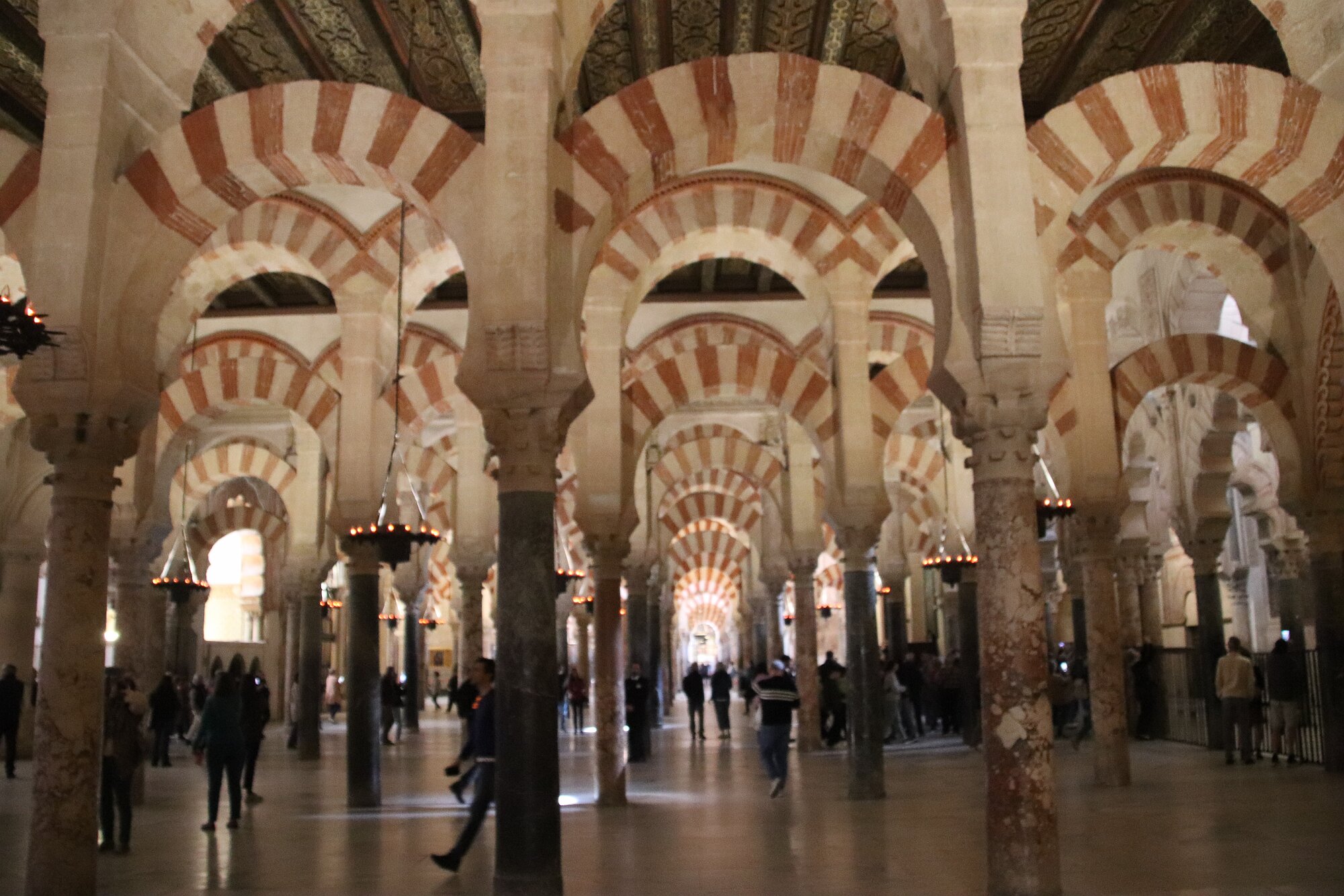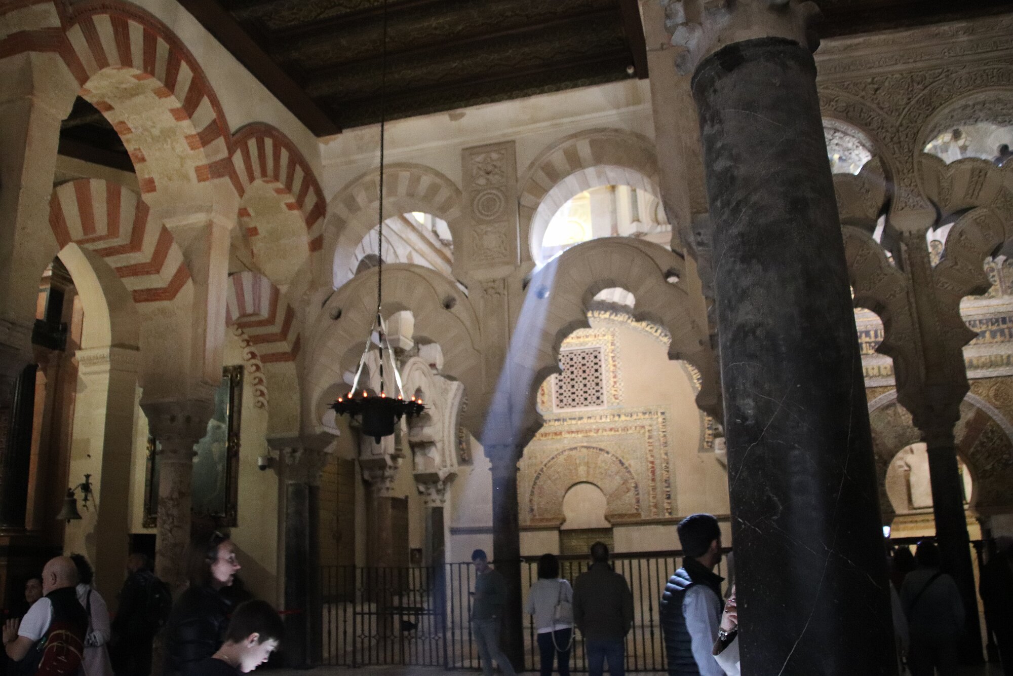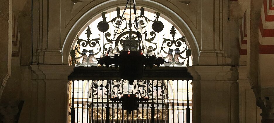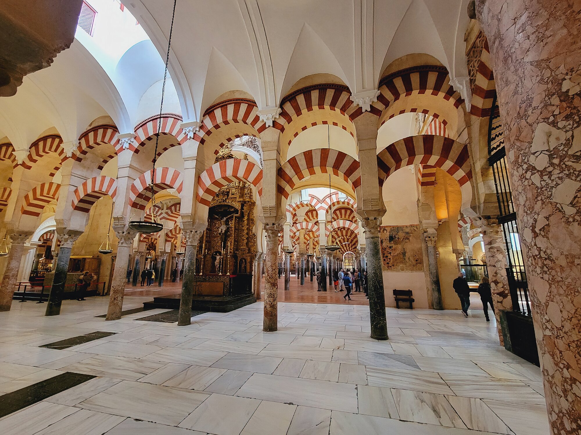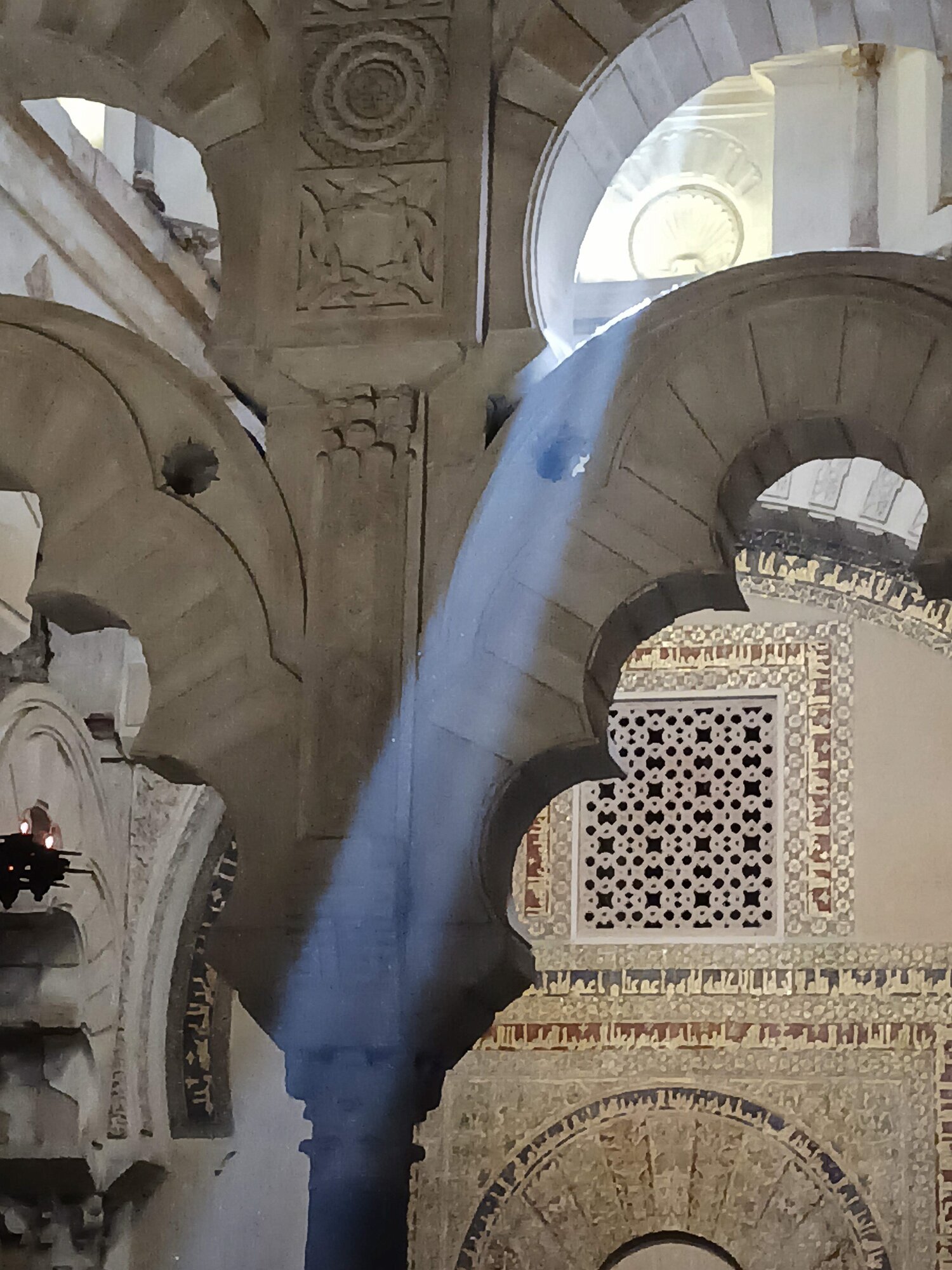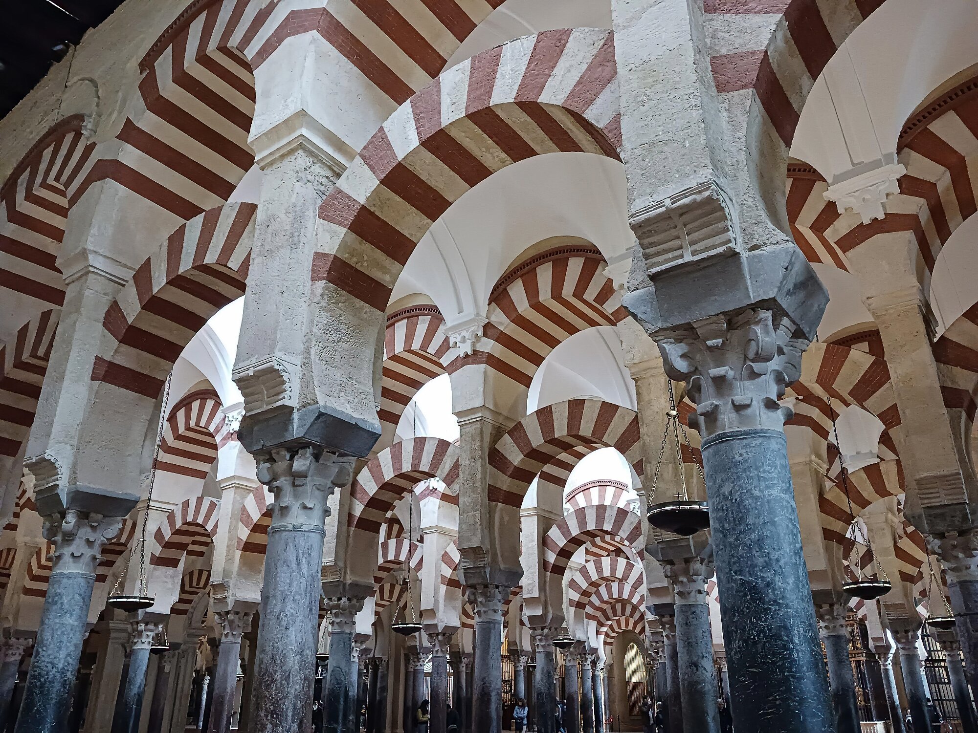 On the patio at Patio del Posadero in Córdoba. We like to stay in this small boutique hotel. Our room was set up very nicely. Córdoba has many small streets for us to wander. We no longer get lost. Bell tower of Altar de San Rafael, off C. Lineros, in Córdoba One of the great breakfasts we were served at Patio del Posadero. Colorful painted wooden ceiling (techo de madera pintado)in the mezquita. Once again. the amazing arches in teh mezquita. Dazzling forms and colors everywhere. A shaft of sunlight and too many details to take in in a single (or 8 or 9) visit(s). In the midst of all the Islamic art, we find a Christian chapel. Close-up of the grill work A forest of arches Wide angle of some of the arches Patricia took a picture of me. In the choir part of the church part of the mezquita. Looking towards the altar deom rhw choir. There are organ pipes on both sides above. Córdoba is proud of its flowered streets. Patricia bought a mask at this small leather shop and the proprieter posed with her. Part of a Roman-era theater which has been excavated under the museum - or the museum was built over the theater. The garden (jardin) on the grounds of the museum. Jerez