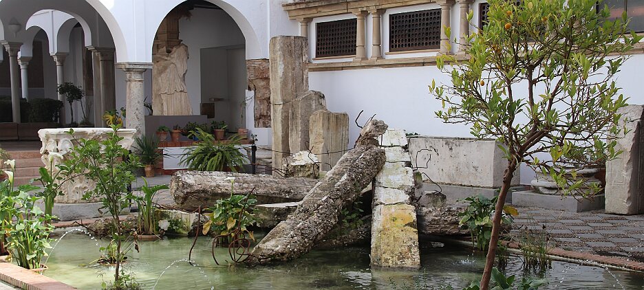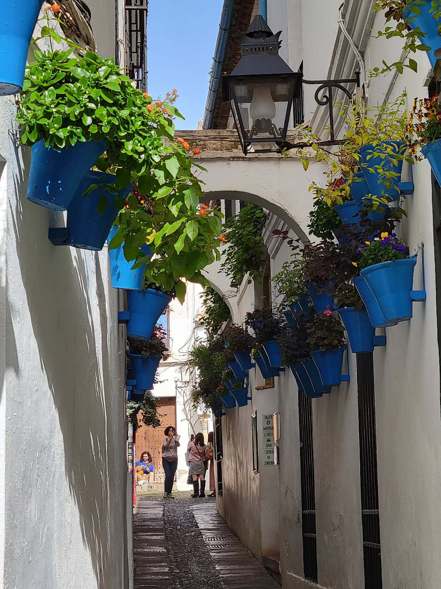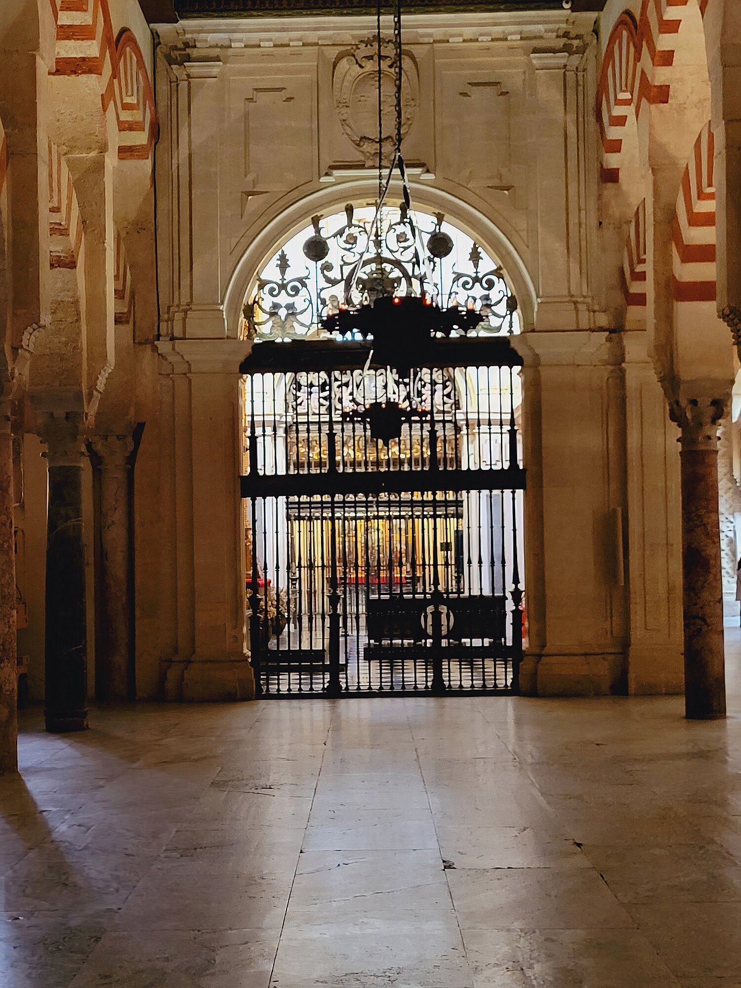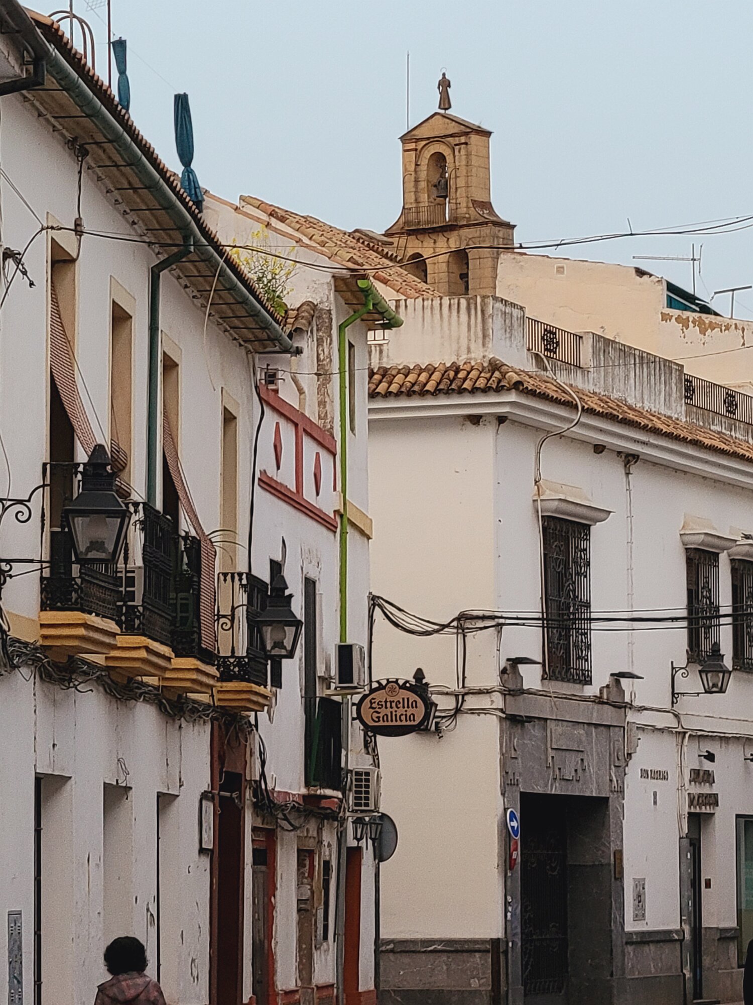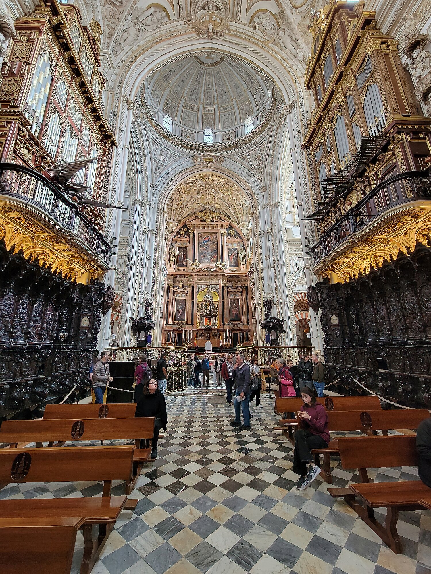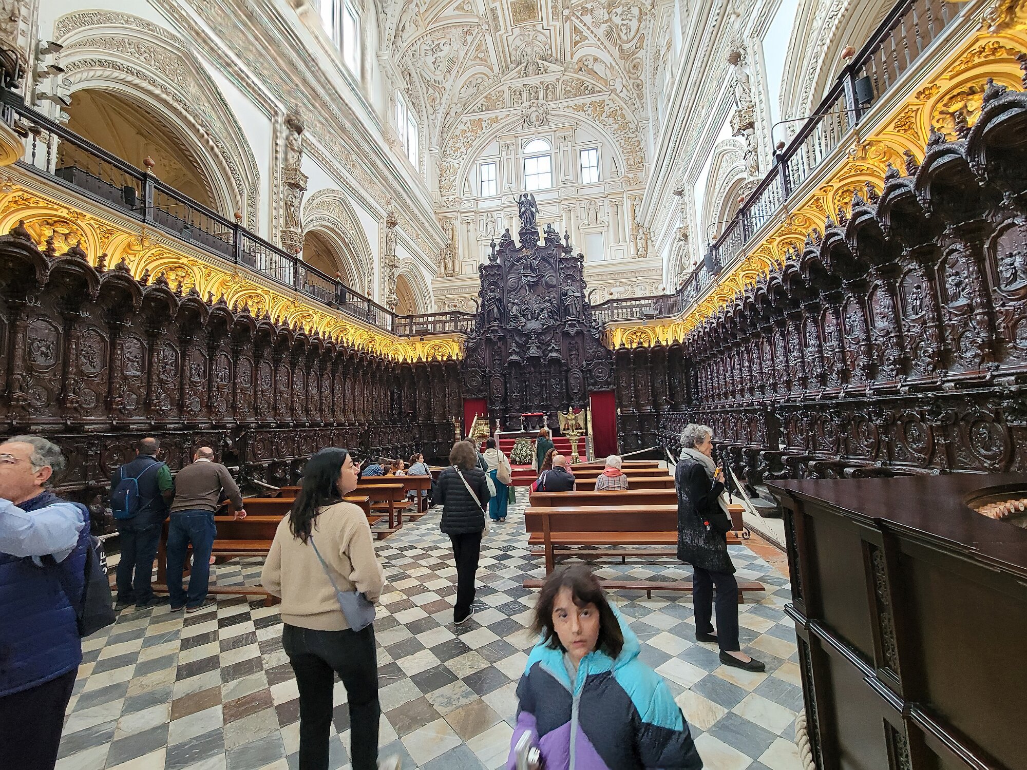 On the patio at Patio del Posadero in Córdoba. We like to stay in this small boutique hotel. Our room was set up very nicely. Córdoba has many small streets for us to wander. We no longer get lost. Bell tower of Altar de San Rafael, off C. Lineros, in Córdoba One of the great breakfasts we were served at Patio del Posadero. Colorful painted wooden ceiling (techo de madera pintado)in the mezquita. Once again. the amazing arches in teh mezquita. Dazzling forms and colors everywhere. A shaft of sunlight and too many details to take in in a single (or 8 or 9) visit(s). In the midst of all the Islamic art, we find a Christian chapel. Close-up of the grill work A forest of arches Wide angle of some of the arches Patricia took a picture of me. In the choir part of the church part of the mezquita. Looking towards the altar deom rhw choir. There are organ pipes on both sides above. Córdoba is proud of its flowered streets. Patricia bought a mask at this small leather shop and the proprieter posed with her. Part of a Roman-era theater which has been excavated under the museum - or the museum was built over the theater. The garden (jardin) on the grounds of the museum. Jerez