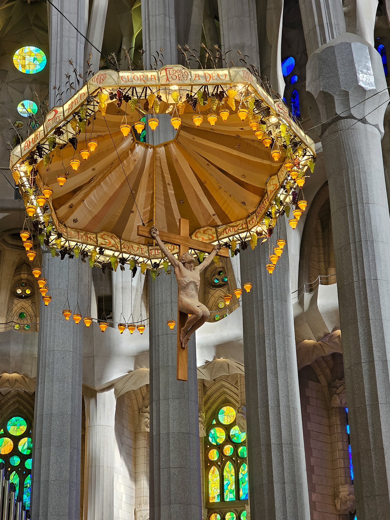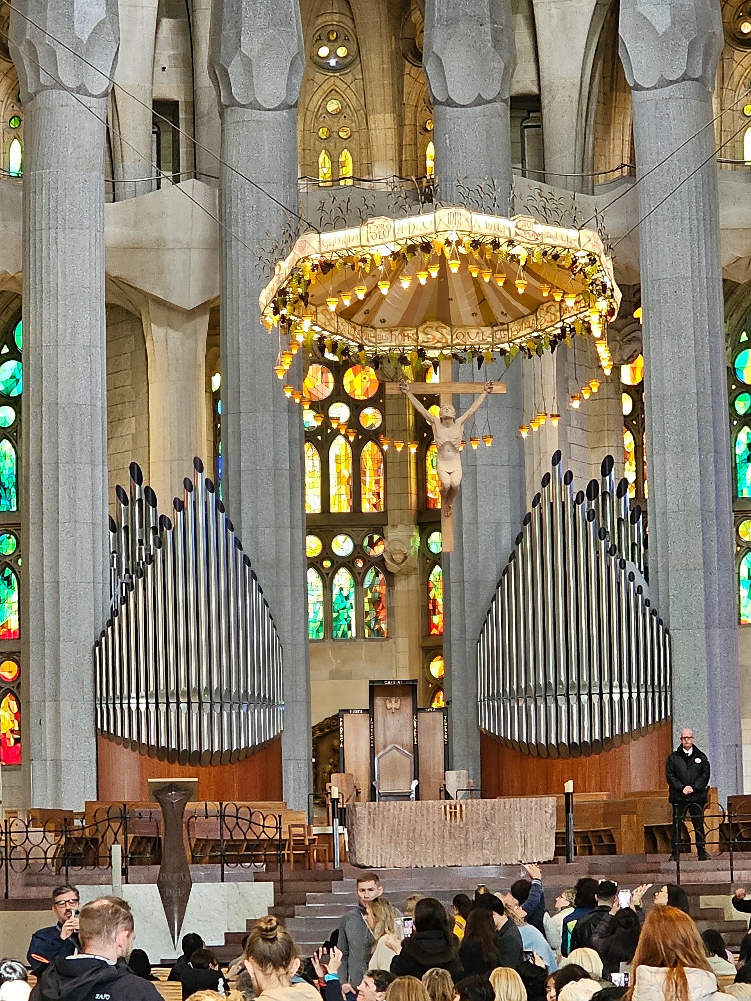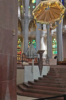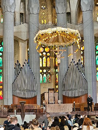 Main altar with crucifix and canopy. Even the organ pipes are art.