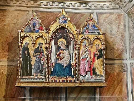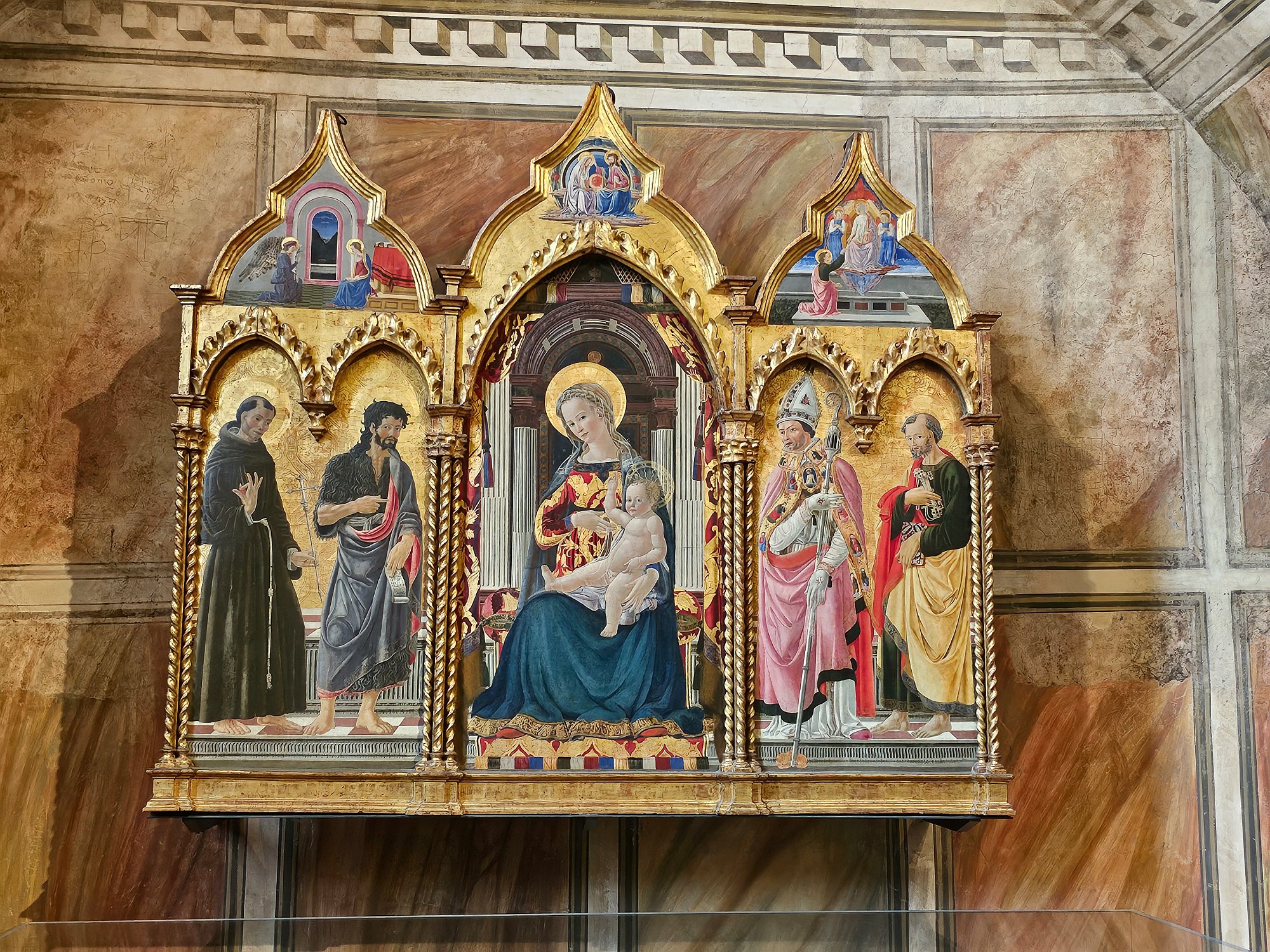 Close up of tryptich Virgin and Child with Sts Francis, John the Baptist, Nicholas and Peter, Giovanni di Francesco (Franco) di Piero, 1450s.
